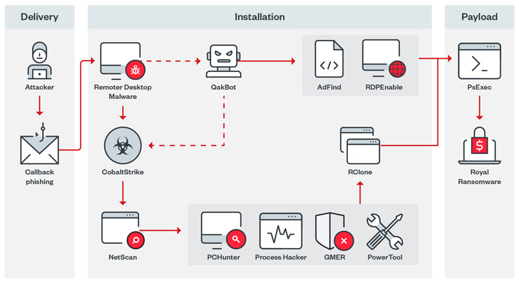 Royal, which has its roots in the now-defunct Conti ransomware operation, has also been observed to utilize call back phishing (or telephone-oriented attack delivery) to trick victims into installing remote desktop software for initial access.